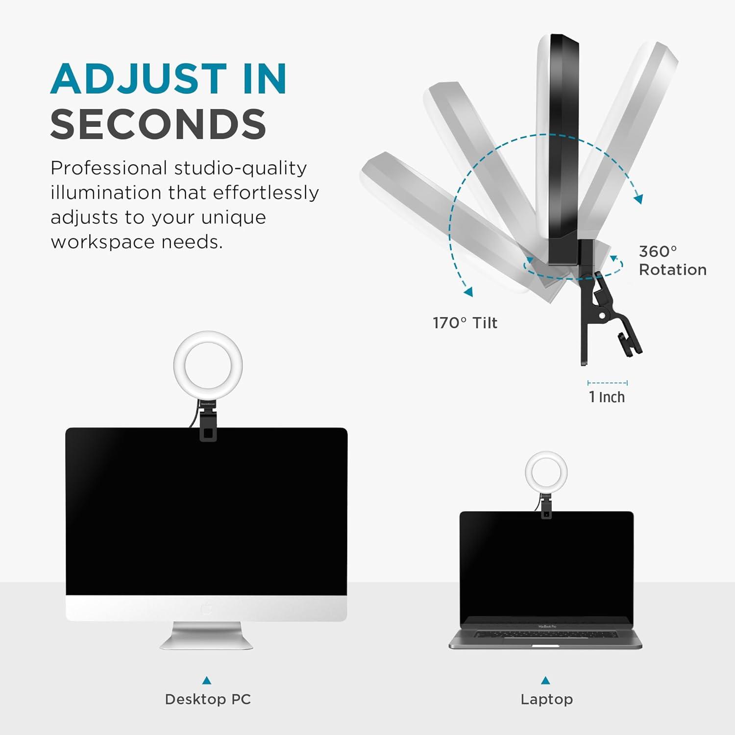 Clip & Go Convenience: No bulky equipment or complicated setups—this ring light for laptop attaches securely to laptops or monitors and includes a mini tripod for standalone use. Perfect for remote workers, streamers, and content creators, it sets up in seconds and travels effortlessly. Whether you're jumping into a last-minute Zoom call, recording a vlog on location, or streaming from a co-working space, enjoy studio-quality lighting without the hassle. The ultra-portable design ensures you always have perfect lighting, anytime, anywhere.