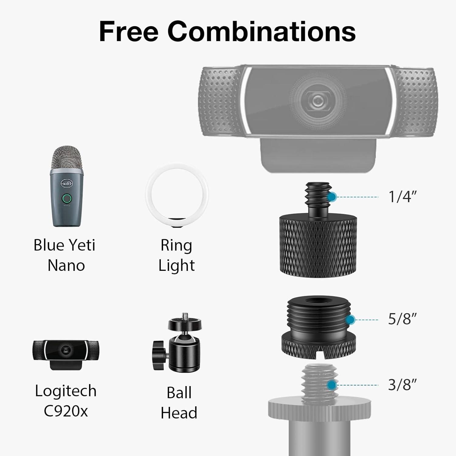 Free Combination: If you find using a single adapter does not match your need, try combining two different screw adapters to use. When the connector of the stand is 3/8”, connected to 3/8” to 5/8” screw and 5/8” to 1/4” screw in turn, then you can connect your 1/4” screw hole of Logitech webcams, cameras, or ring lights.