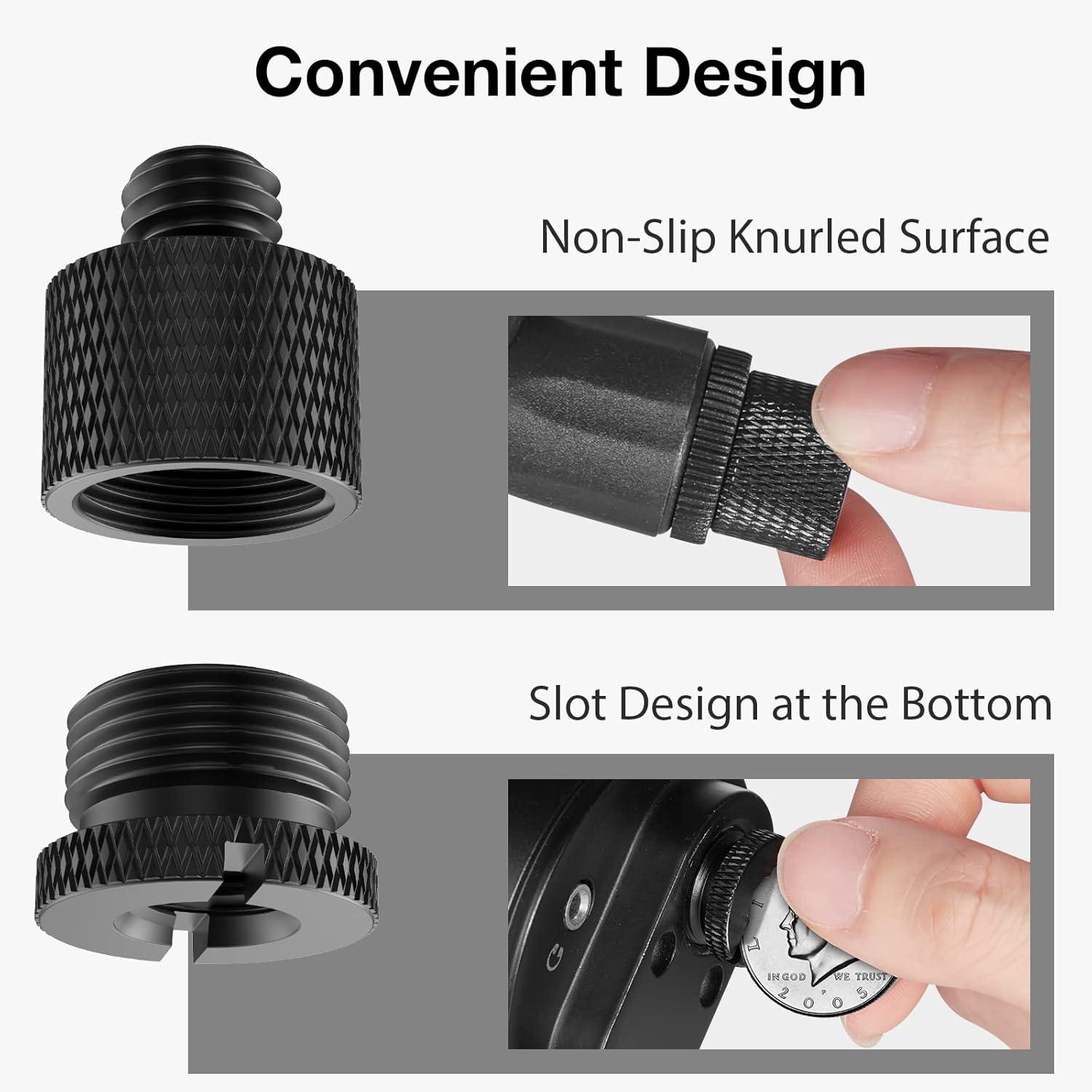 Non-slip Design: The knurled surface provides a good grip for easy installation and disassembly. The 3/8” to 5/8” and 1/4” to 5/8” screw adapters have a slot design at their bottoms for handy use with tools, saving your time in converting between stands and devices.