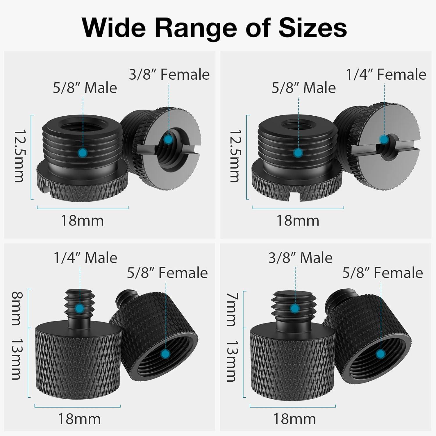 Four Different Sizes: The package includes 8 pcs mic stand screw adapters in total: 2 pcs 3/8” female to 5/8” male adapters, 2 pcs 1/4” female to 5/8” male adapters, 2 pcs 5/8” female to 1/4” male adapters, 2 pcs 5/8” female to 3/8” male adapters, freely used in various situations like podcasting, filming, recording and photography.