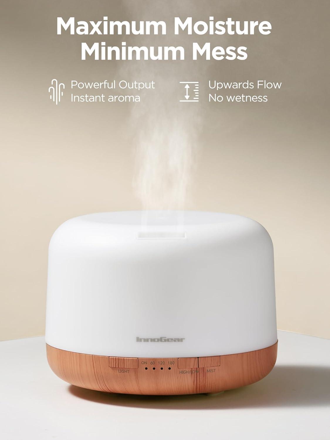 Prolonged Aromatherapy and Humidification: With a capacious 500ml and easy-to-clean water tank, the InnoGear oil diffuser can run for up to 18 hours (9-12h for strong mist and 16-18h for weak) without the need for mid-session refills, to elevate your sensory experience from the moment you wake for the day to the last few minutes before you drift off to sleep at night.