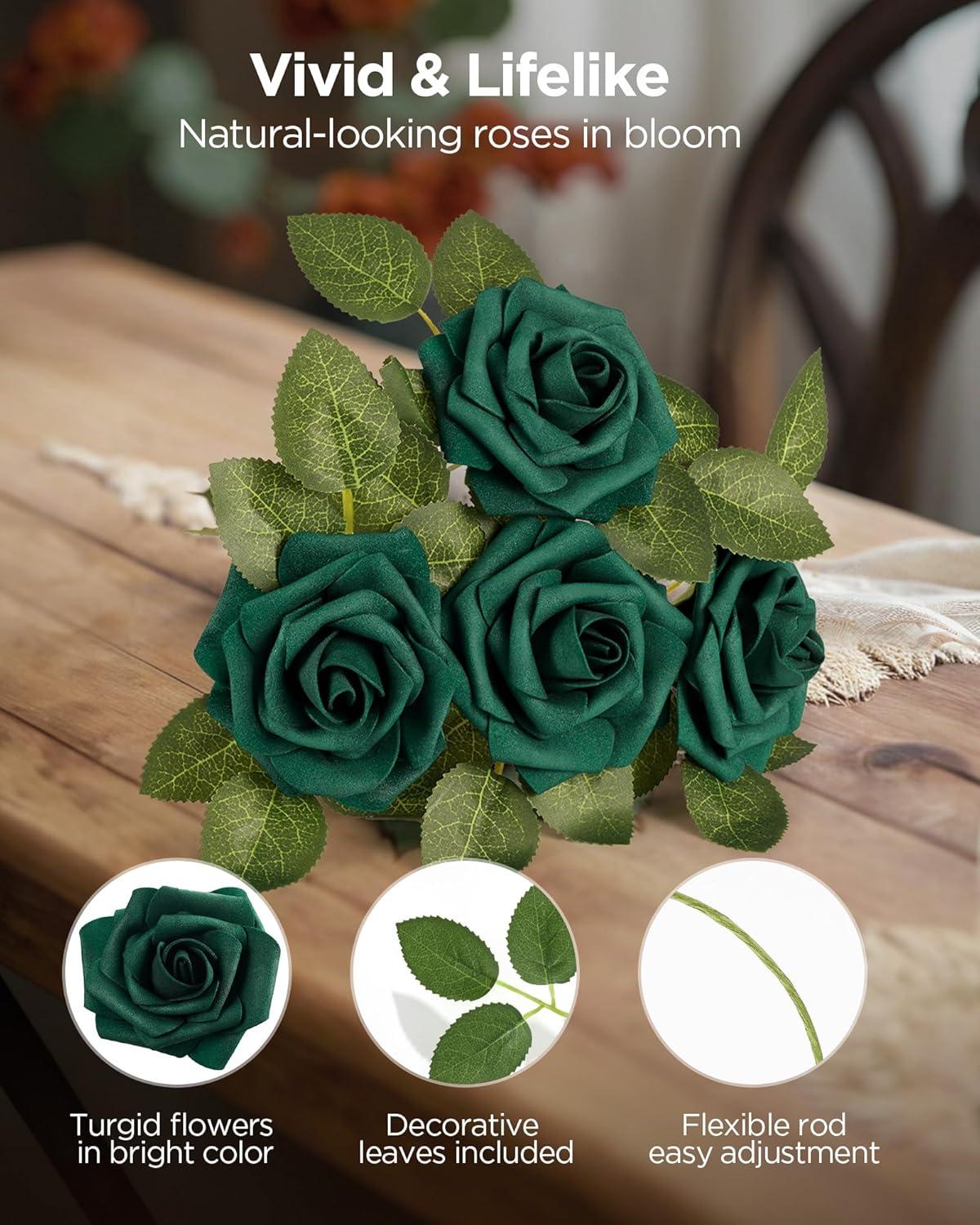 InnoGear Artificial Flowers, 50 Pcs Dark Red Foam Fake Roses Bulk with Stems for Decoration Celebration DIY Wedding Bouquets Centerpieces Bridal Shower Party Christmas Tree(Hunt Green)