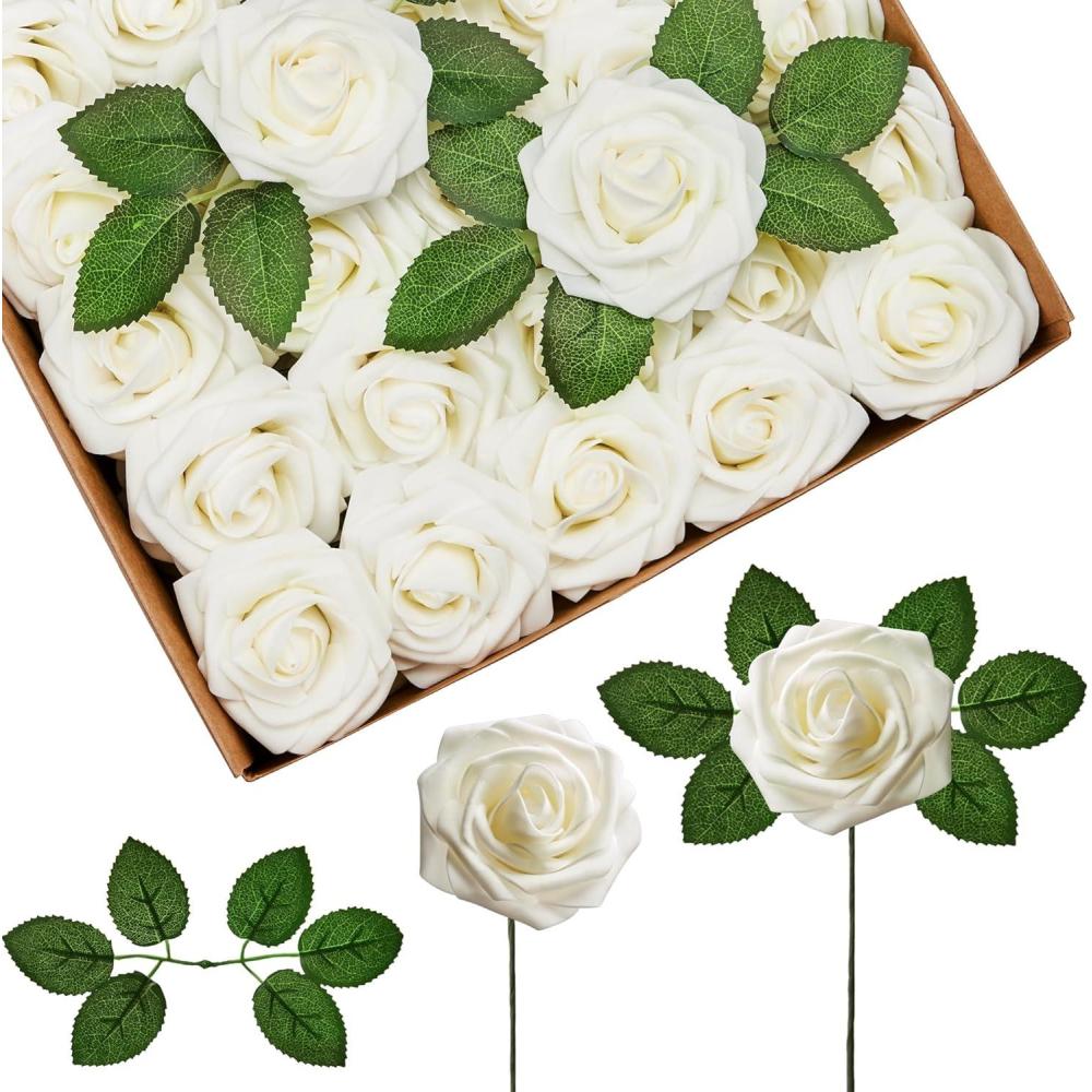 imageInnoGear Artificial Flowers 50 Pcs Dark Red Foam Fake Roses Bulk with Stems for Decoration Celebration DIY Wedding Bouquets Centerpieces Bridal Shower Party Christmas TreeIvory