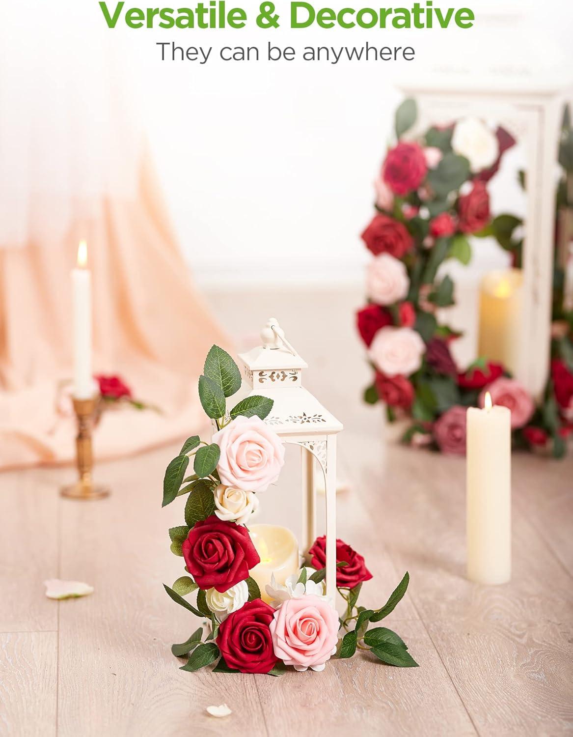 50 Artificial Flowers with 10 Green Leaves: With an innovative flexible stem design, these DIY artificial roses offer unparalleled adaptability. Easily bend, cut, or remove stems to suit your creative needs, whether you're crafting bouquets, boutonnieres, cake decorations, headbands, or any other imaginative floral arrangement.
