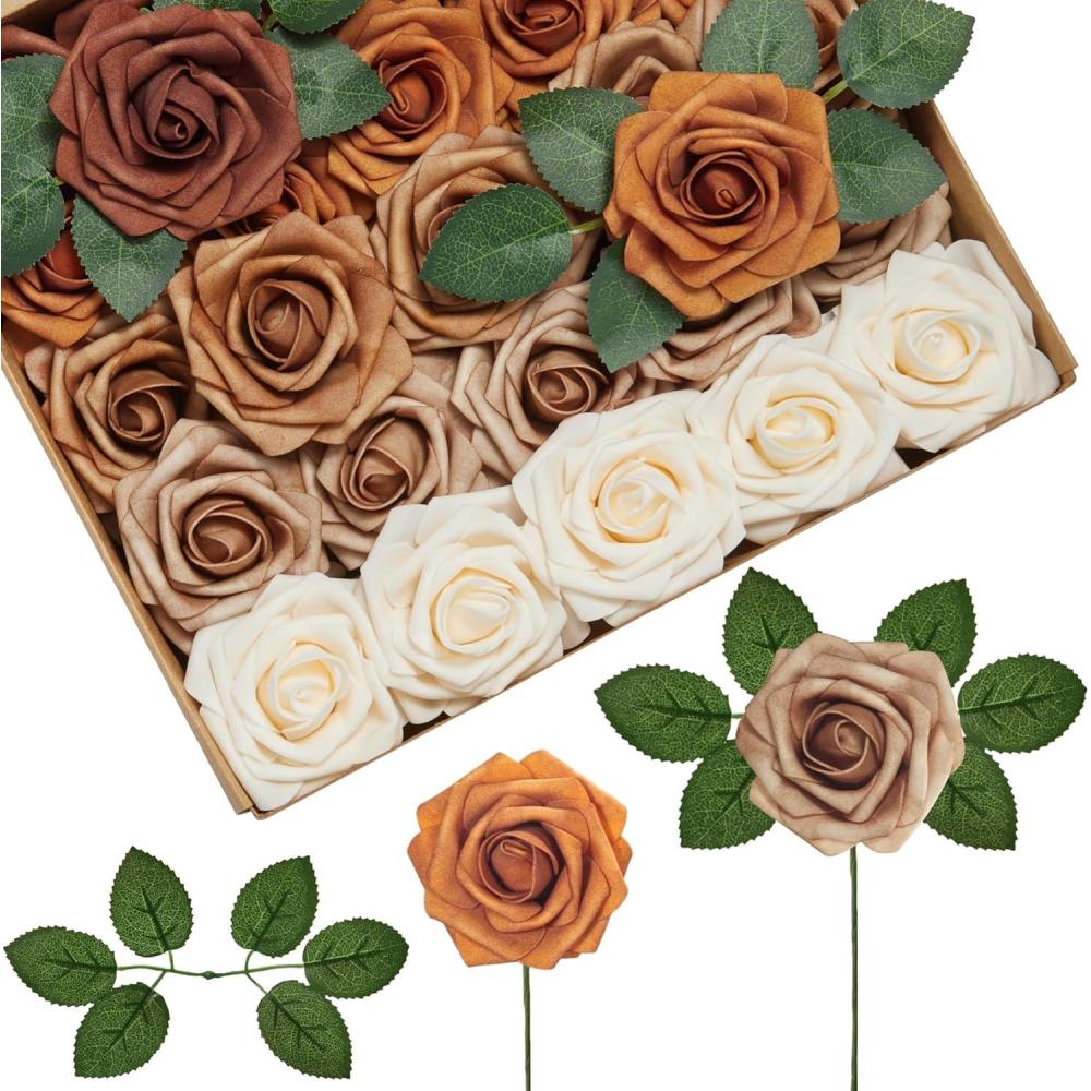 InnoGear Artificial Flowers, 50 Pcs Dark Red Foam Fake Roses Bulk with Stems for Decoration Celebration DIY Wedding Bouquets Centerpieces Bridal Shower Party Christmas Tree(Shades of Earth Tones)
