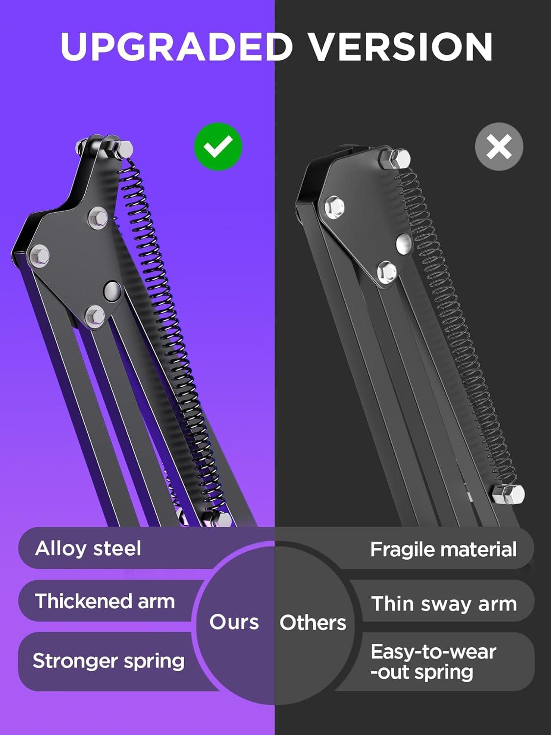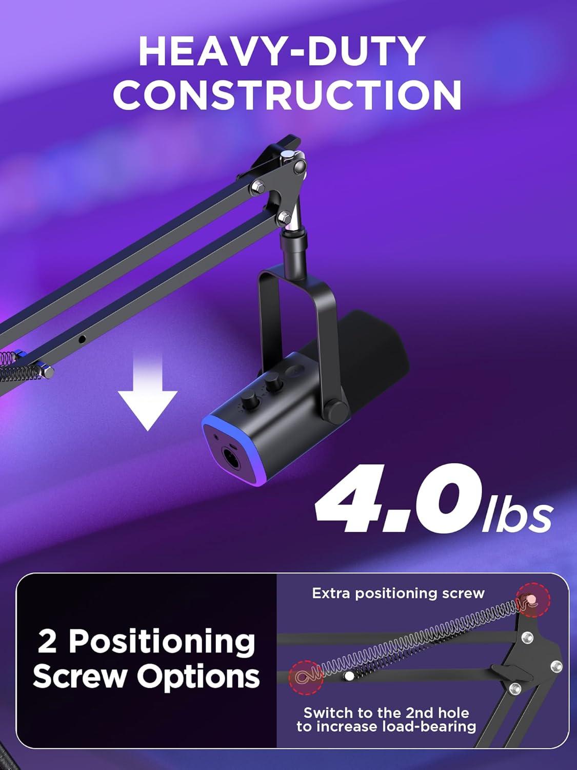 Solid & Heavy-duty: High-quality steel material with super-strong springs and extra positioning hole ensures an excellent load-bearing capacity of 3.3lb/1.5kg, compared to others of 2.2lb/1.0kg. InnoGear boom stand provides effortless and silent microphone positioning, which is vital in live recording situations.