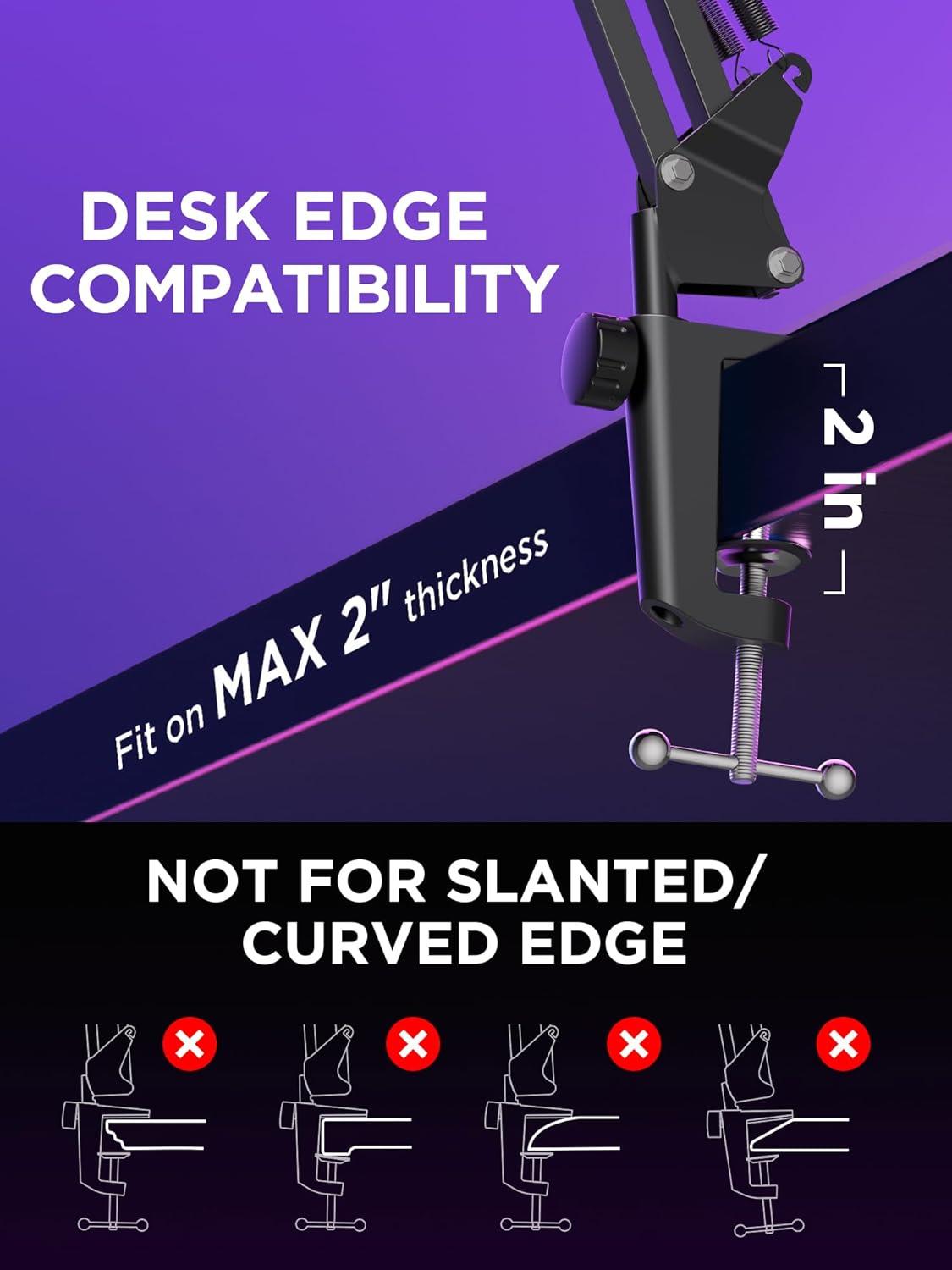 Desk Edge Compatibility: The desk clamp is specifically designed to securely grip squared edges up to 2 inches in thickness; please ensure your desk edge is flat and not slanted or curved for optimal functionality.