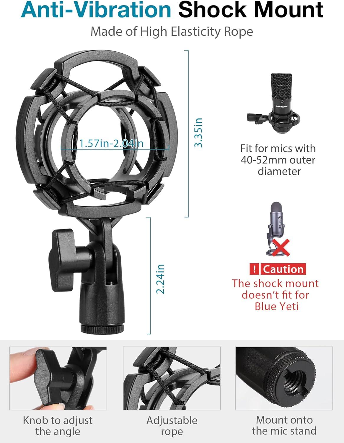 High Quality Shock Mount: It can protect your microphone all-around with high elasticity wrap roping desigh and reduce vibrations from traveling into the microphone. Please noted the shock mount is not fit for Blue Yeti.