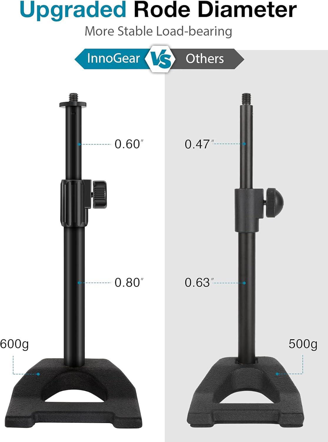 Compact and Weighted Base: With 4.3″x4.7″ base, InnoGear desk microphone stand doesn't taking up much space. The base is weighted 1.32lbs for MAX load 3.3lbs when using heavier microphones that need additional balance. It is constructed of heavy-duty steel for long-term performance.