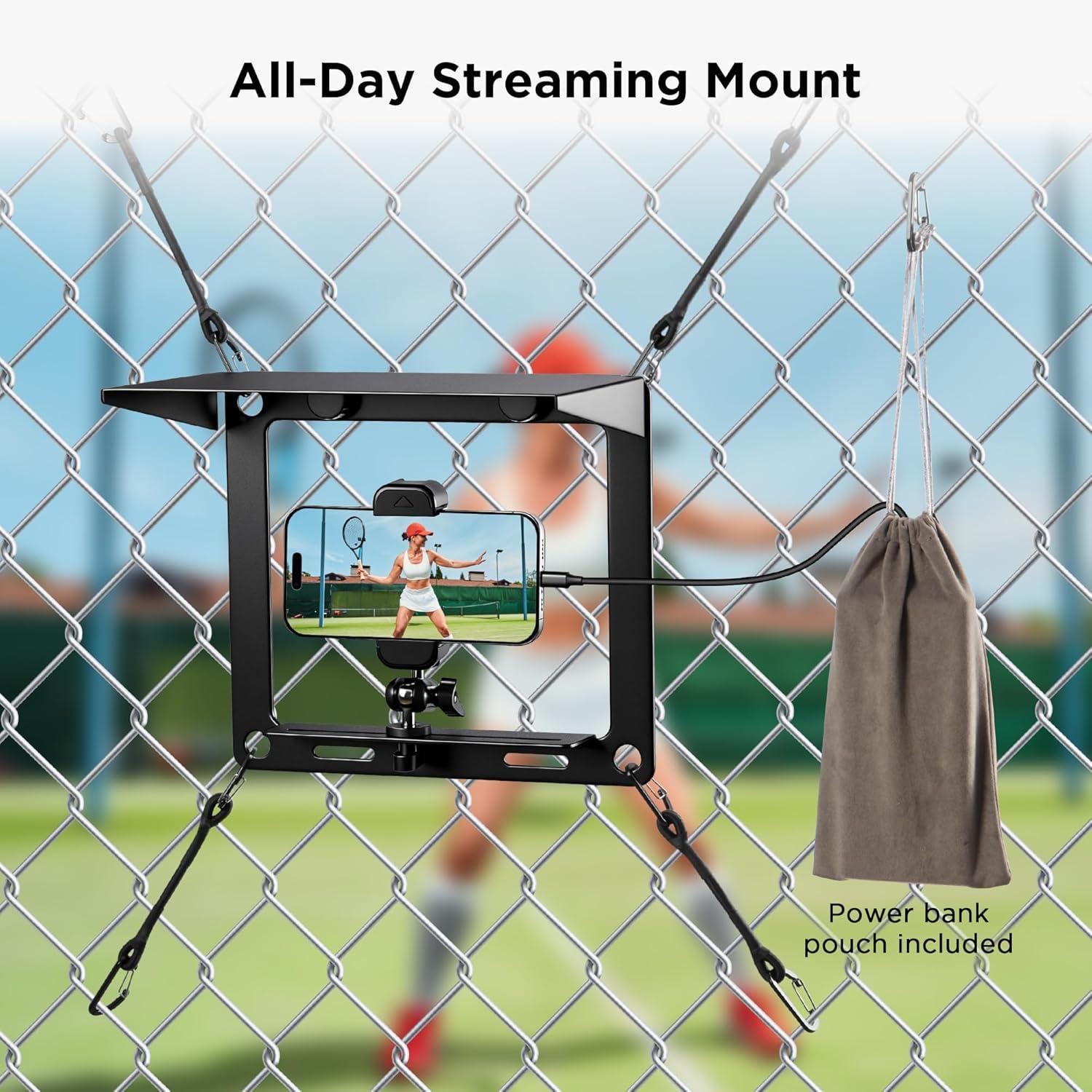 Ready-to-Stream Kit: This active camera fence mount is a complete streaming station, not just a mount. We include essential accessories like an useful power bank storage bag for extended live streams and a bracket shade to combat screen glare. Everything you need for a successful, uninterrupted broadcast is included right in the box.