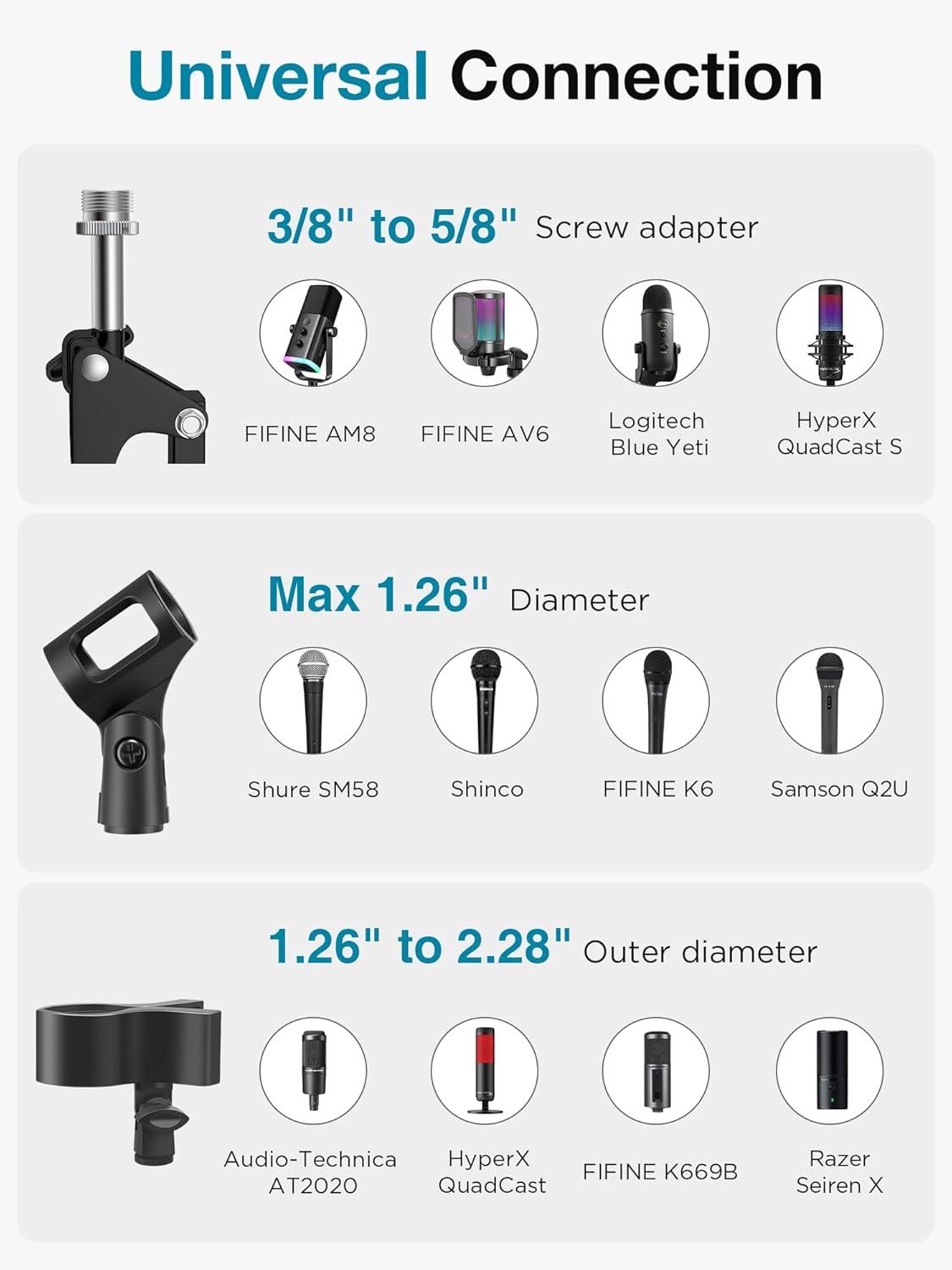 Universal Compatibility: Designed to accommodate a wide range of microphones, this microphone stand ensures compatibility with Hyper X QuadCast, SoloCast, Fifine K669B AM8, Blue Yeti, Shure SM7B, AT2020, and more. The included 3/8″ to 5/8″ , and 3/8″ to 1/4″ screw adapter expand your options to use with not only mics but webcams and ringlights, while the universal mic clip is perfect for dynamic microphones like the Shure SM58, Shure PGA48, Shure SM48. Whether you're a seasoned professional or just starting out, our boom arm has you covered.