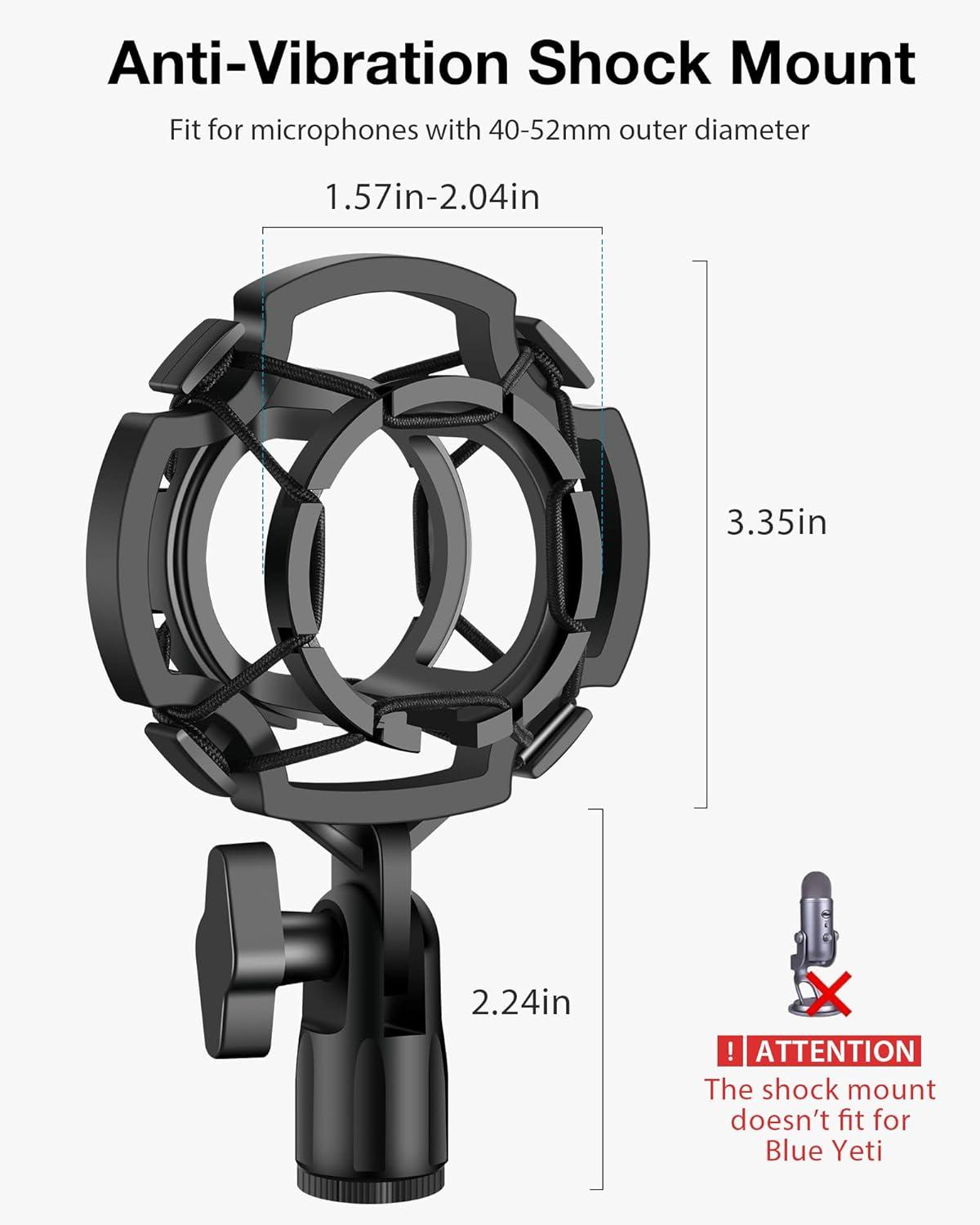 Durable Shock Mount: The quality-made shock mount fits for microphones with an outer diameter of 40-52mm, protecting your microphone all-around with high elasticity wrap roping design and reducing vibrations during using the desk mic stand. Please note the shock mount does NOT fit for Blue Yeti.