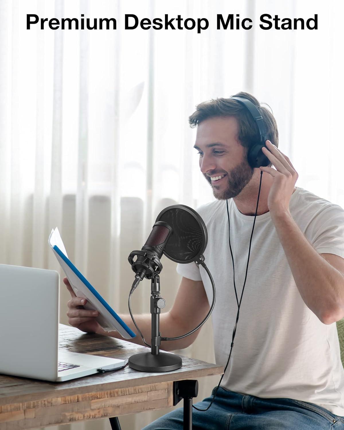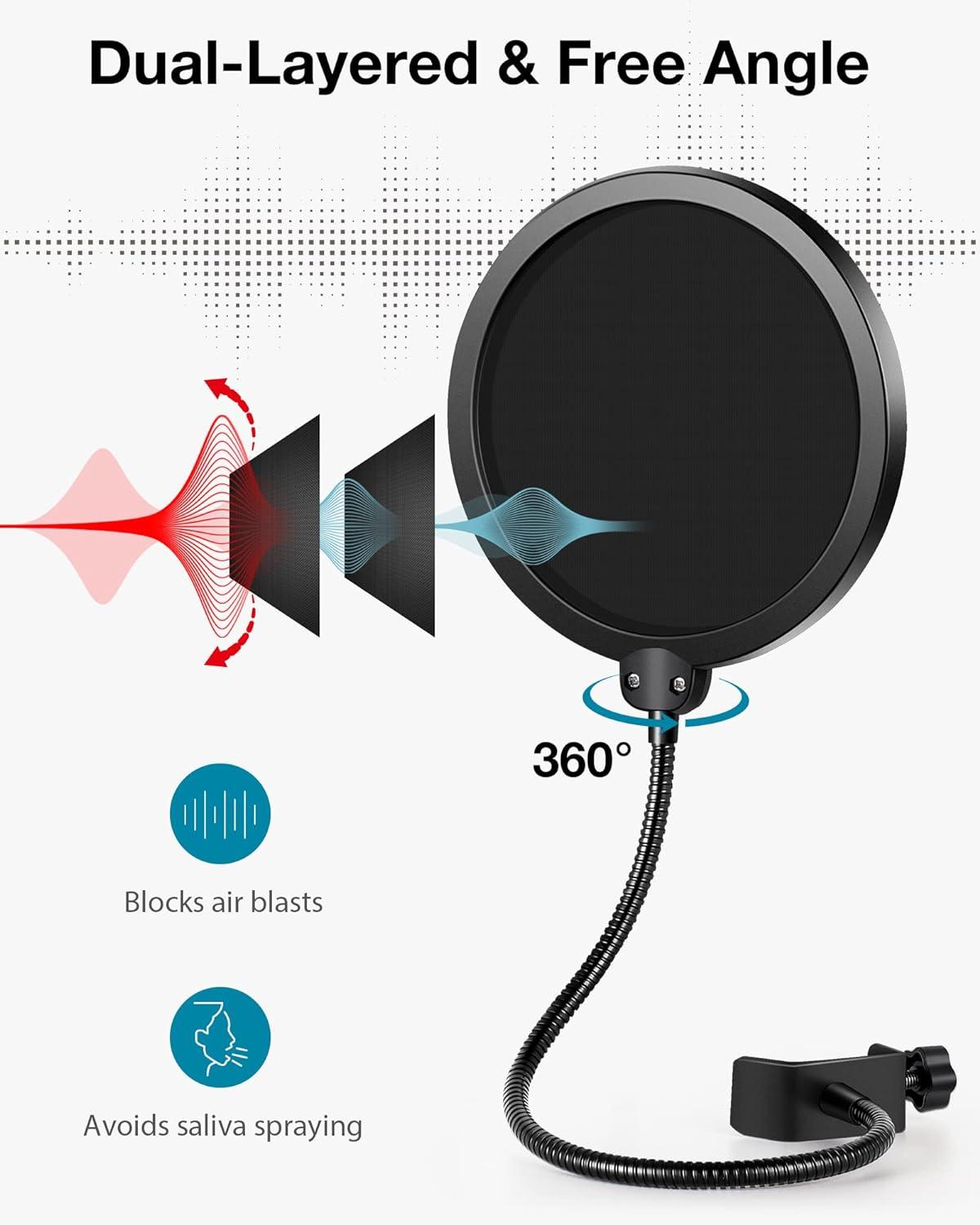 Free Angle Pop Filter: The gooseneck is 360° adjustable in all directions. Freely adjust the angle to create ideal voice, for the dual-layered pop filter effectively blocks air blasts and banishes the annoying hissing and lisping sounds.
