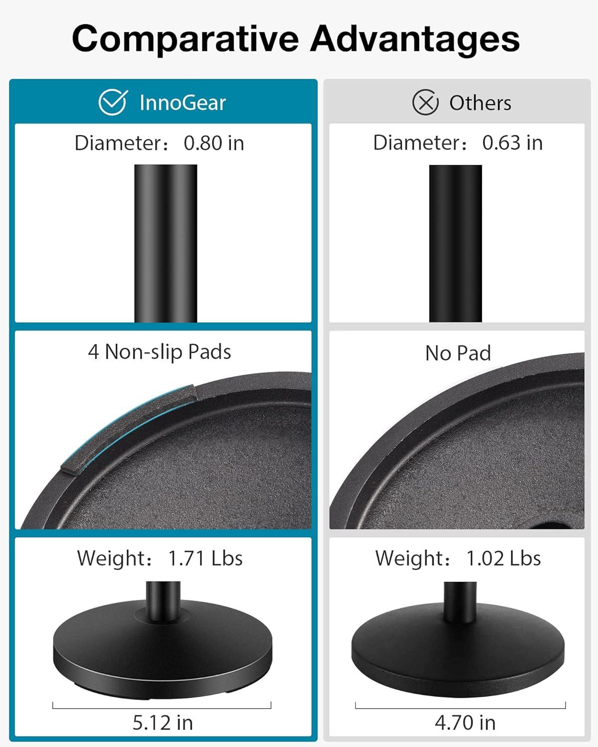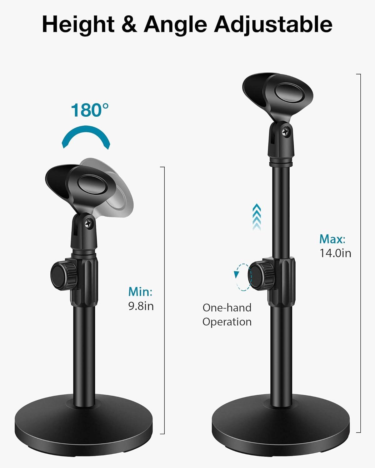 Upgraded Stable Base: The weight of the metal base has been increased to 1.37 lbs and the base diameter is increased to 5.12 inches, having a larger bearing capacity, not easy to tip over. It also features four non-slip pads at the bottom to prevent table scratches and reduce noise when moving the desktop mic stand.