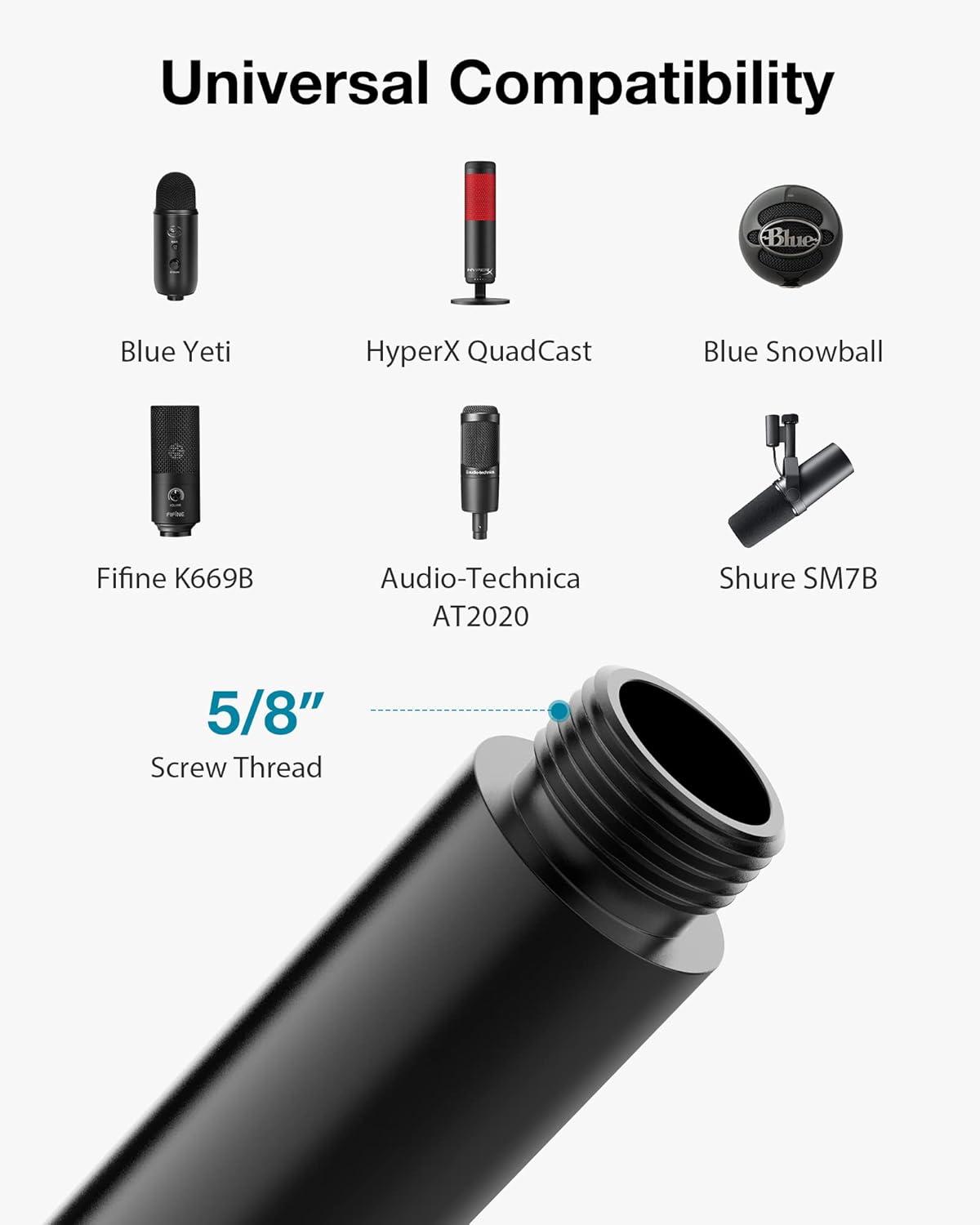 Broad Compatibility: The 5/8” male thread of the extension tube is compatible with most shock mounts and microphones such as Shure SM7B, Shure MV7, Blue Yeti, Hyper X QuadCast, SoloCast, Blue Snowball, AT2020, AT2020USB+, ATR2500-USB, ATR2100-USB, Fifine K669B, optimizing your recording experience.