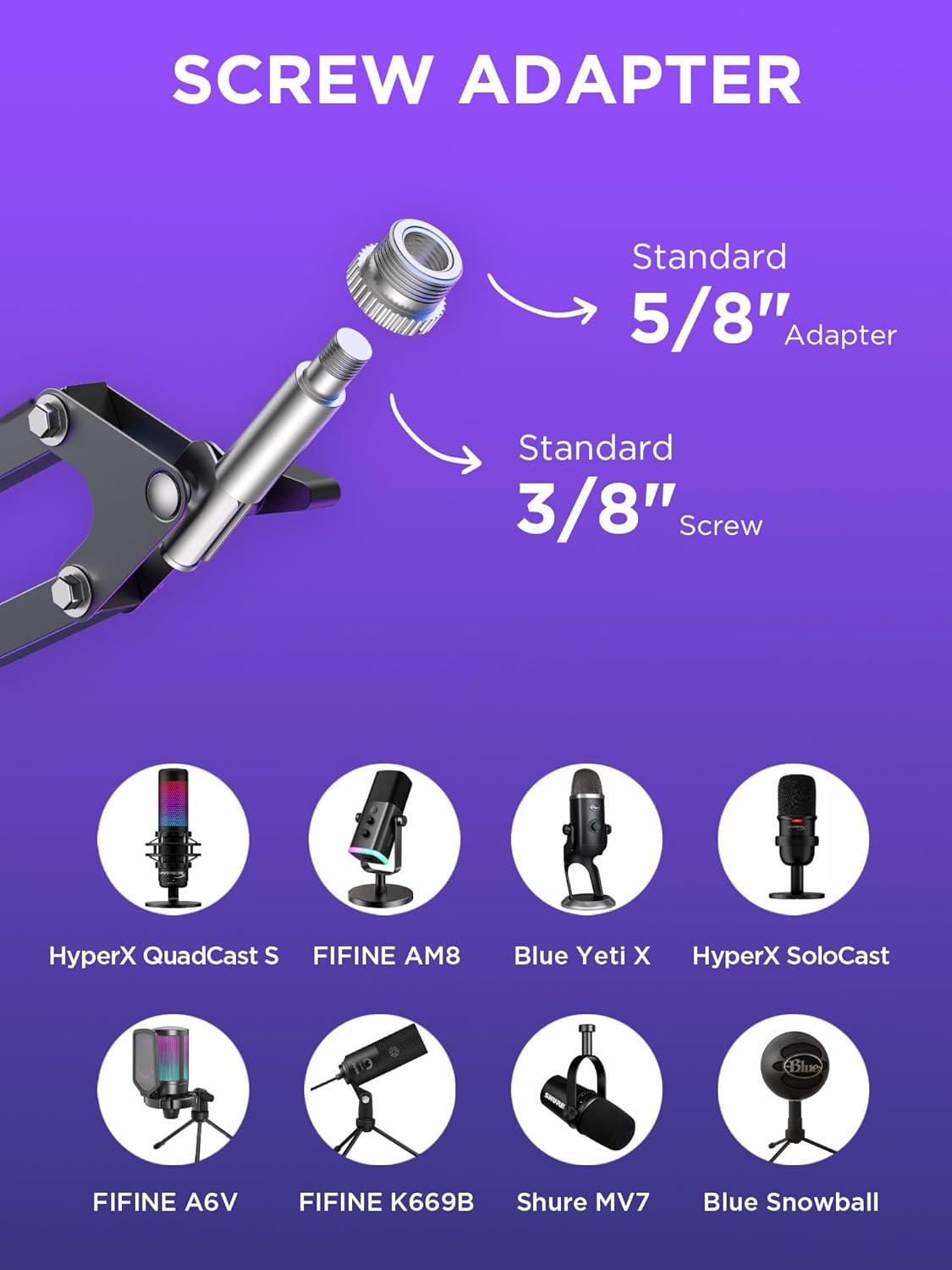 Mic Compatibility: This mic arm stand allows diversity and compatibility, for it comes with a standard mic clip to fit for dynamic microphones like Shure SM58, Samson Q2U, Shure PGA48 and more, and a 5/8″ to 3/8″ adapter for Blue Yeti, Blue Snowball, Blue Snowball iCE, Hyper X QuadCast, SoloCast, Shure SM7B, MV7, Fifine AmpliGame, Fifine K669B (Shock mount not included), Fifine AM8, etc, and a microphone holder to use with mics with an outer diameter of 32-58mm.