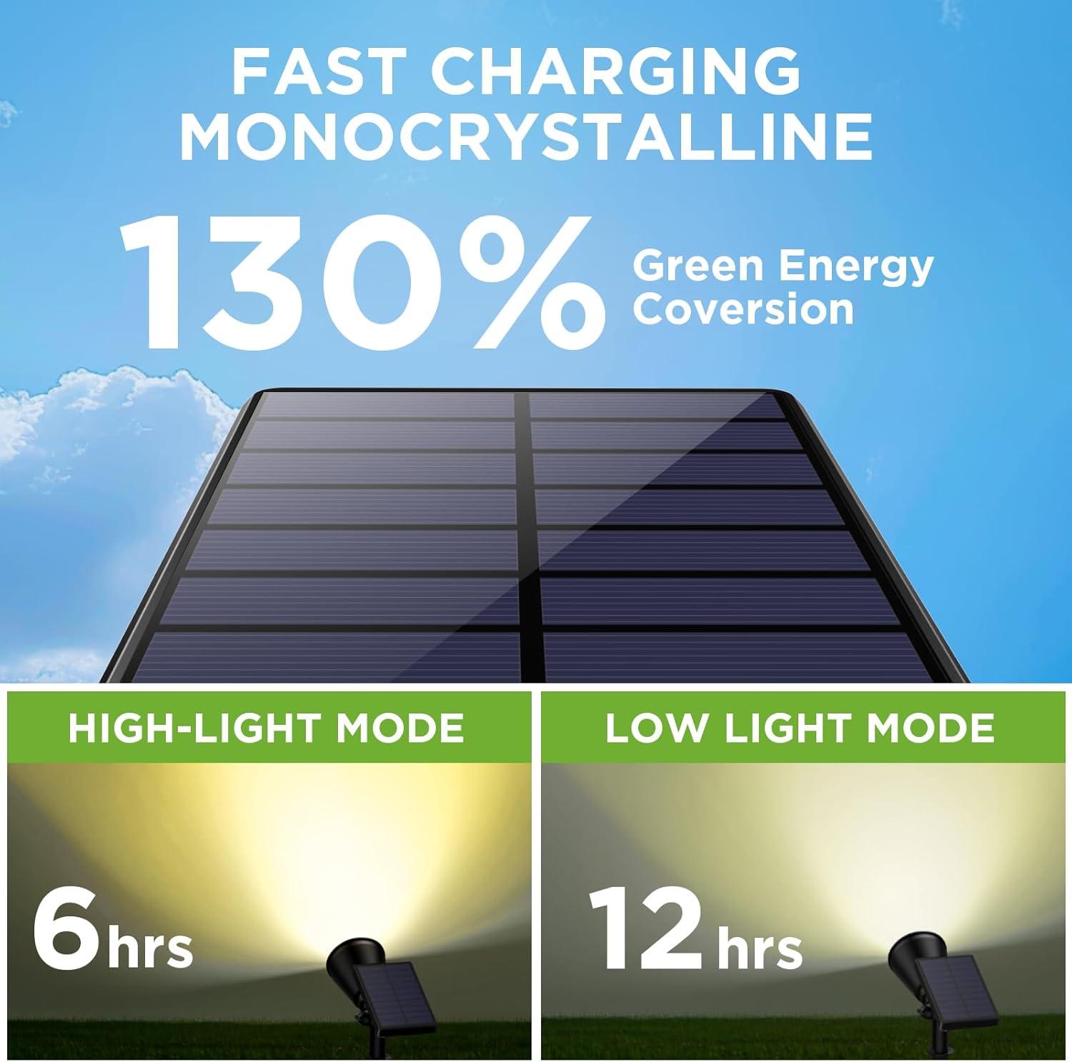 Improved Brightness & 2 Working Modes: With super brightness, this solar spotlight can cast a focused ray to highlight your flagpole or beautiful sculpture, even on the darkest of nights. You have the option to set from High Mode (MAX 6Hrs) to Low Mode (MAX 12Hrs) to extend working time.