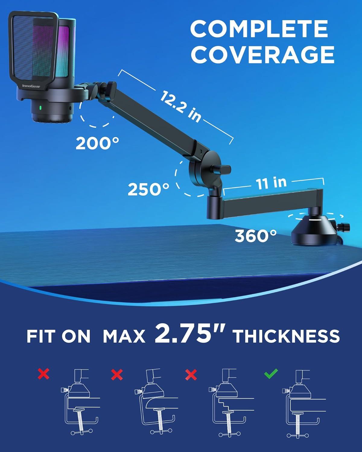 Sleek, Fully Adjustable Low Profile Boom Arm: Achieve the perfect mic positioning with the low-profile boom arm's 360° horizontal rotation and 250° vertical adjustment. The extendable arm reaches up to 25.6 inches, offering flexibility for any workspace, while keeping your setup sleek and clutter-free.