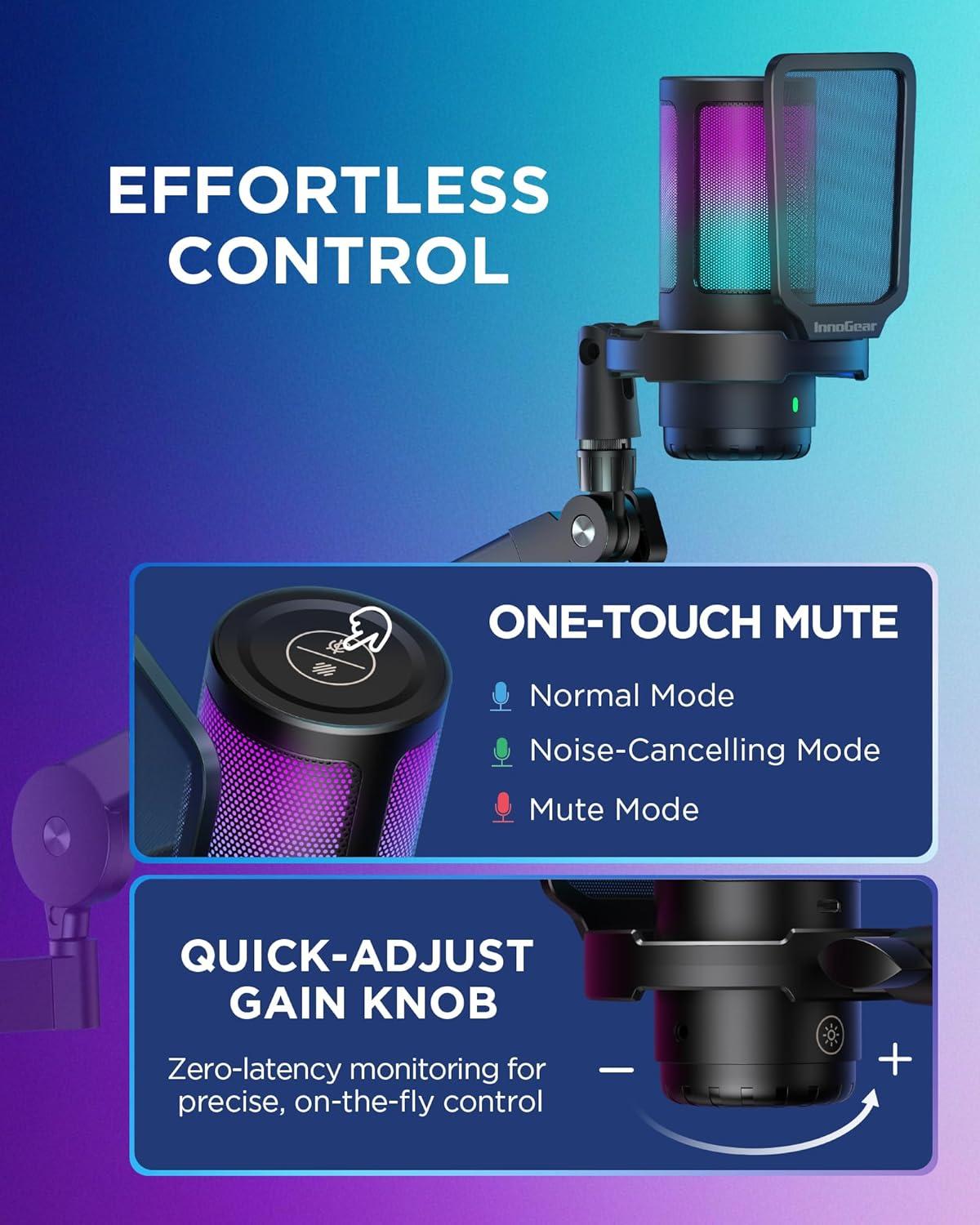 InnoGear USB Gaming Microphone Set, Noise Cancellation Condenser Mic with Boom Arm RGB Mute Headphones Jack for Streaming Podcasting Recording Vocal PC Computer YouTube Discord PS4 PS5, Black(Black)