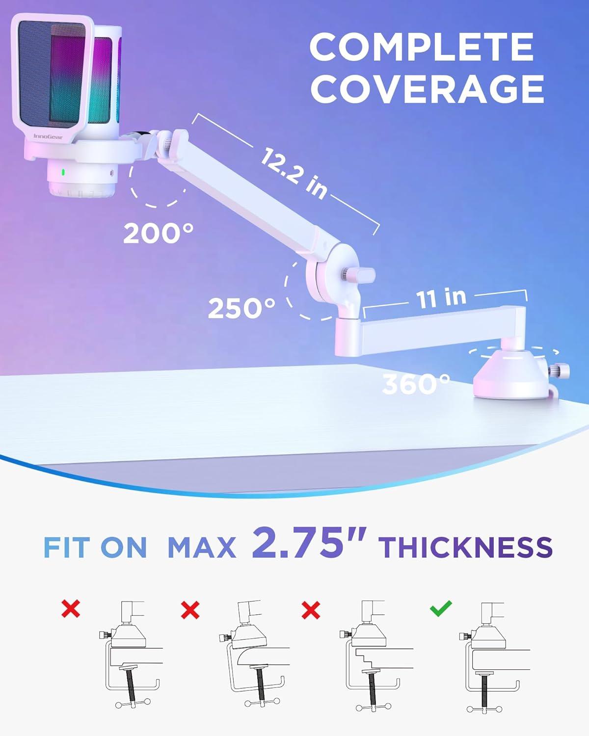 Sleek, Fully Adjustable Low Profile Boom Arm: Achieve the perfect mic positioning with the low-profile boom arm's 360° horizontal rotation and 250° vertical adjustment. The extendable arm reaches up to 25.6 inches, offering flexibility for any workspace, while keeping your setup sleek and clutter-free.