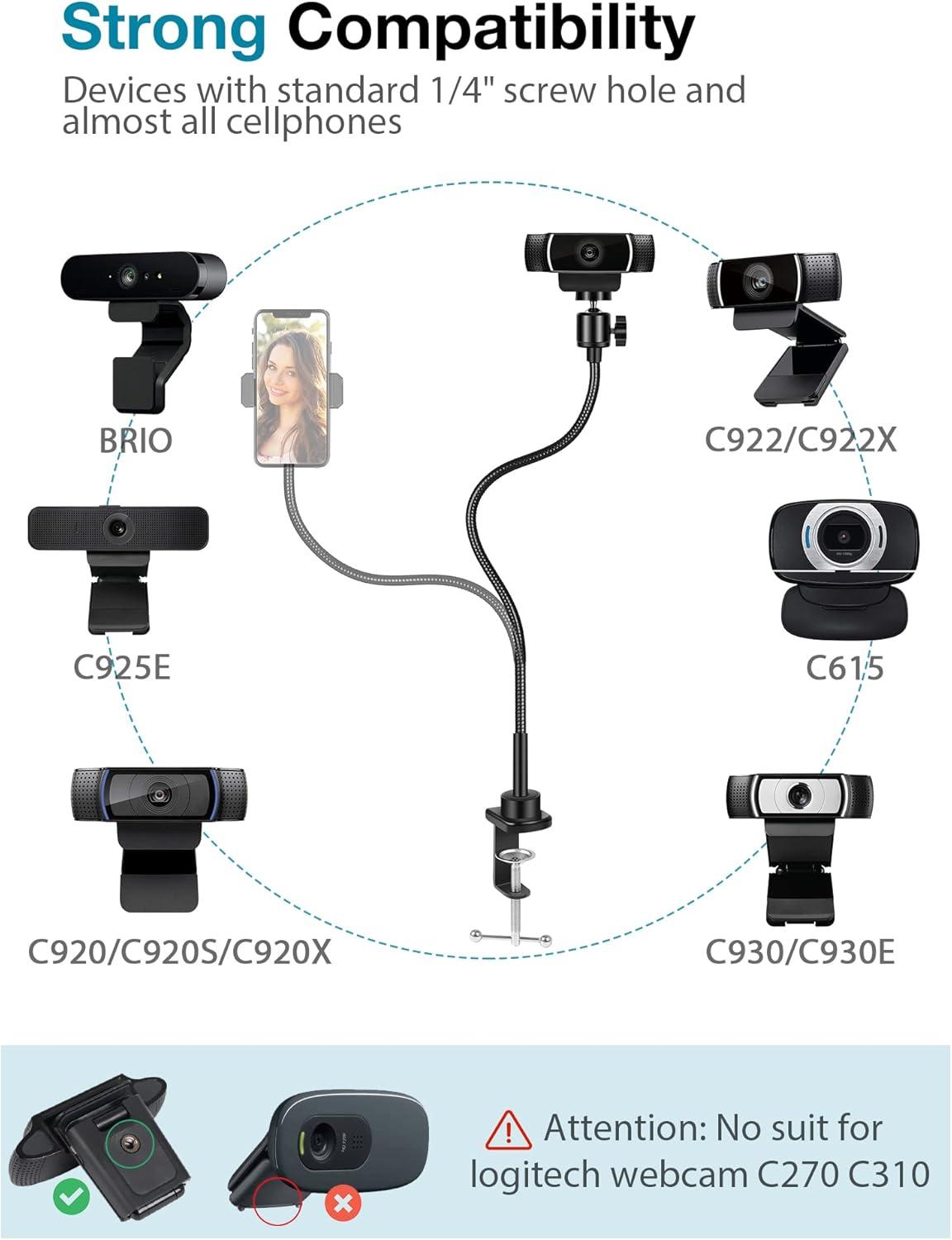 Universal Compatibility: InnoGear quality-made gooseneck stand is compatible with most webcams and almost all mobile phones. It is suitable for logitech webcam BRIO 4K C960 C920 C920S C922 C922x C925e C930 C930e C615, NexiGo N60, etc (expect for Logitech Webcam C270 C310), and other devices with the standard 1/4″ screw hole.