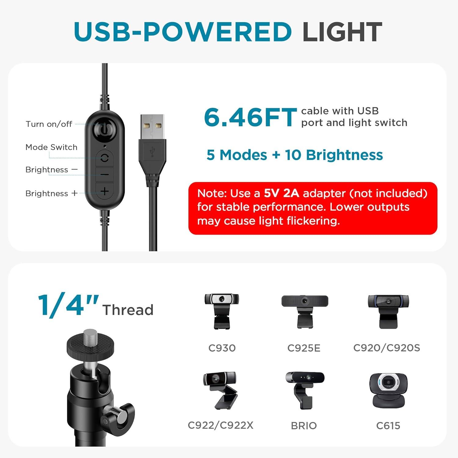 The zoom lighting for computer is USB-powered. It includes a 6.46ft cable with a USB port. This USB-powered light requires a 5V adapter with a minimum current of 2A (e.g., 5V/2A, 5V/3A, or 5V/2A+ adapter)- not a laptop USB port (typically 5V/1A). IMPORTANT: The voltage must be exactly 5V (no higher or lower), and the current can be equal to or greater than 2A to ensure safe and optimal performance. Using a lower-output adapter may cause the light to turn on and off intermittently.