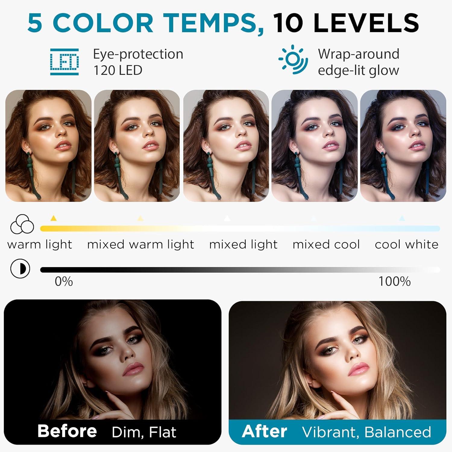 5 Modes 10 Levels: Command broadcast-quality light with a single, intuitive dial. Seamlessly transition through 5 studio-grade color temperatures (from warm to cool white) and 10 precision brightness levels (10%-100%) to discover your most confident, camera-ready look. It’s instant professional calibration—effortlessly tailored to your environment with no confusing apps or complicated menus required.